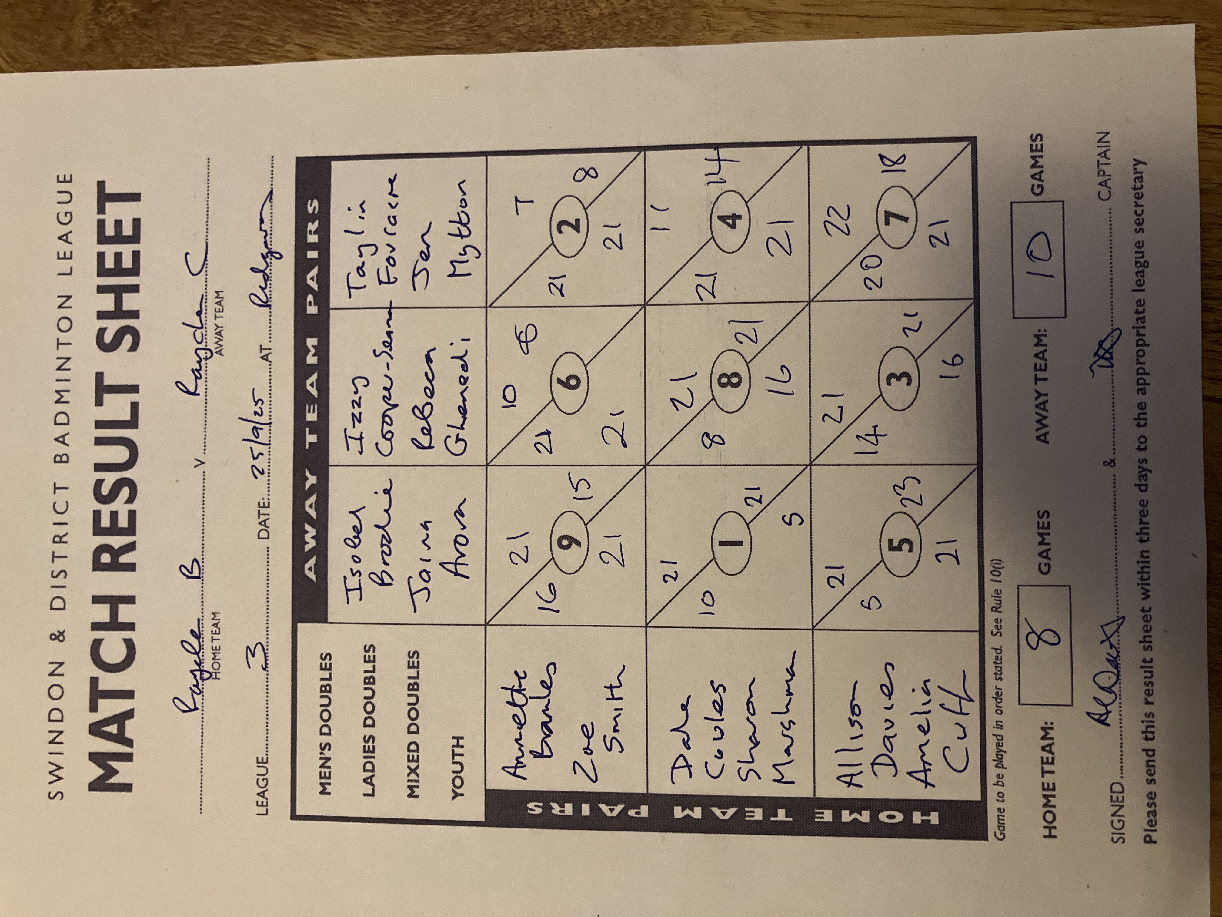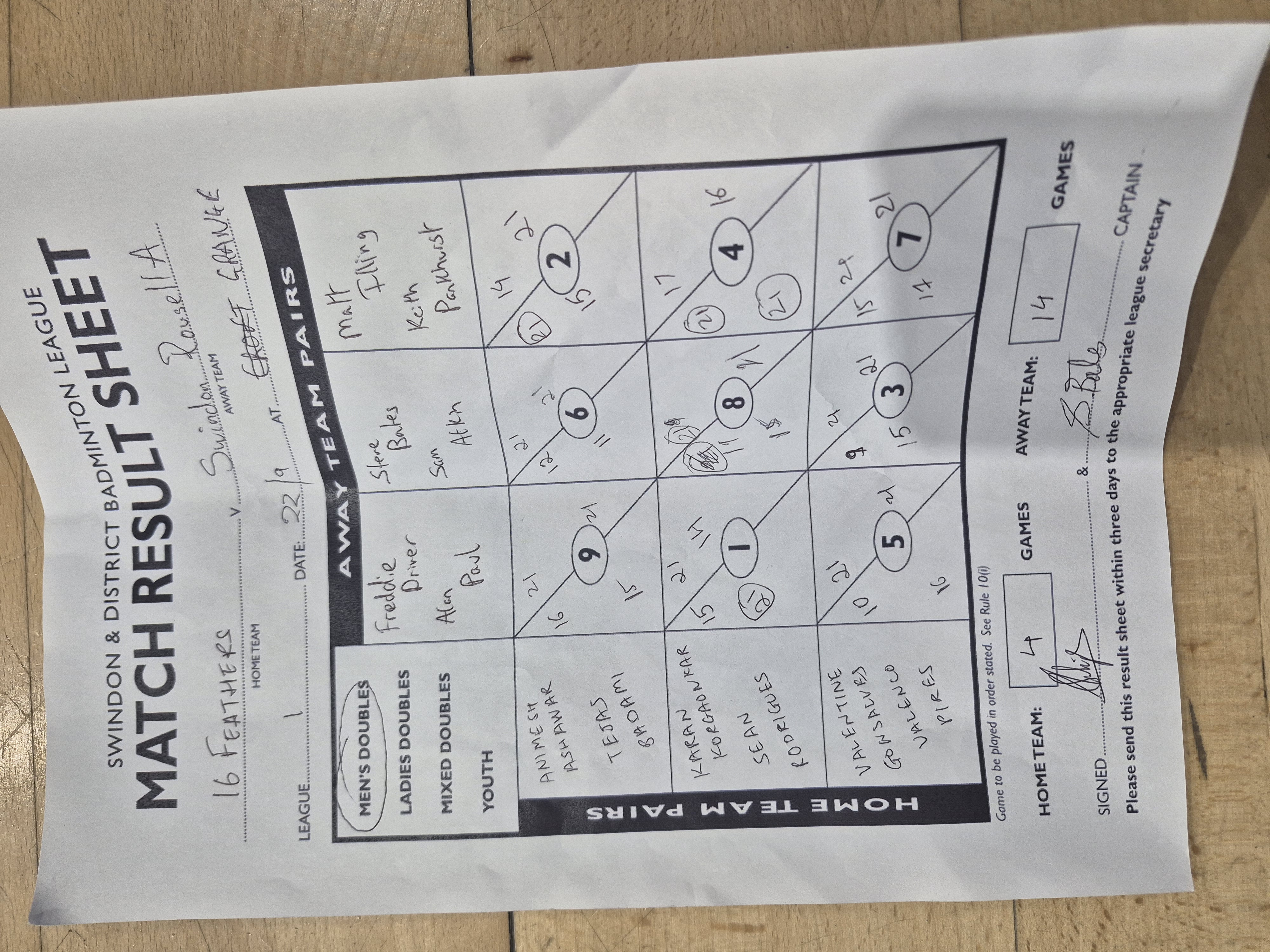 22-09-2025 | 19:00 | Monday | 16 Feathers A | Swindon-Roussel A | Grange Leisure and Community Centre, Grange Dr, Swindon, SN3 4JY | 4 - 14 | |