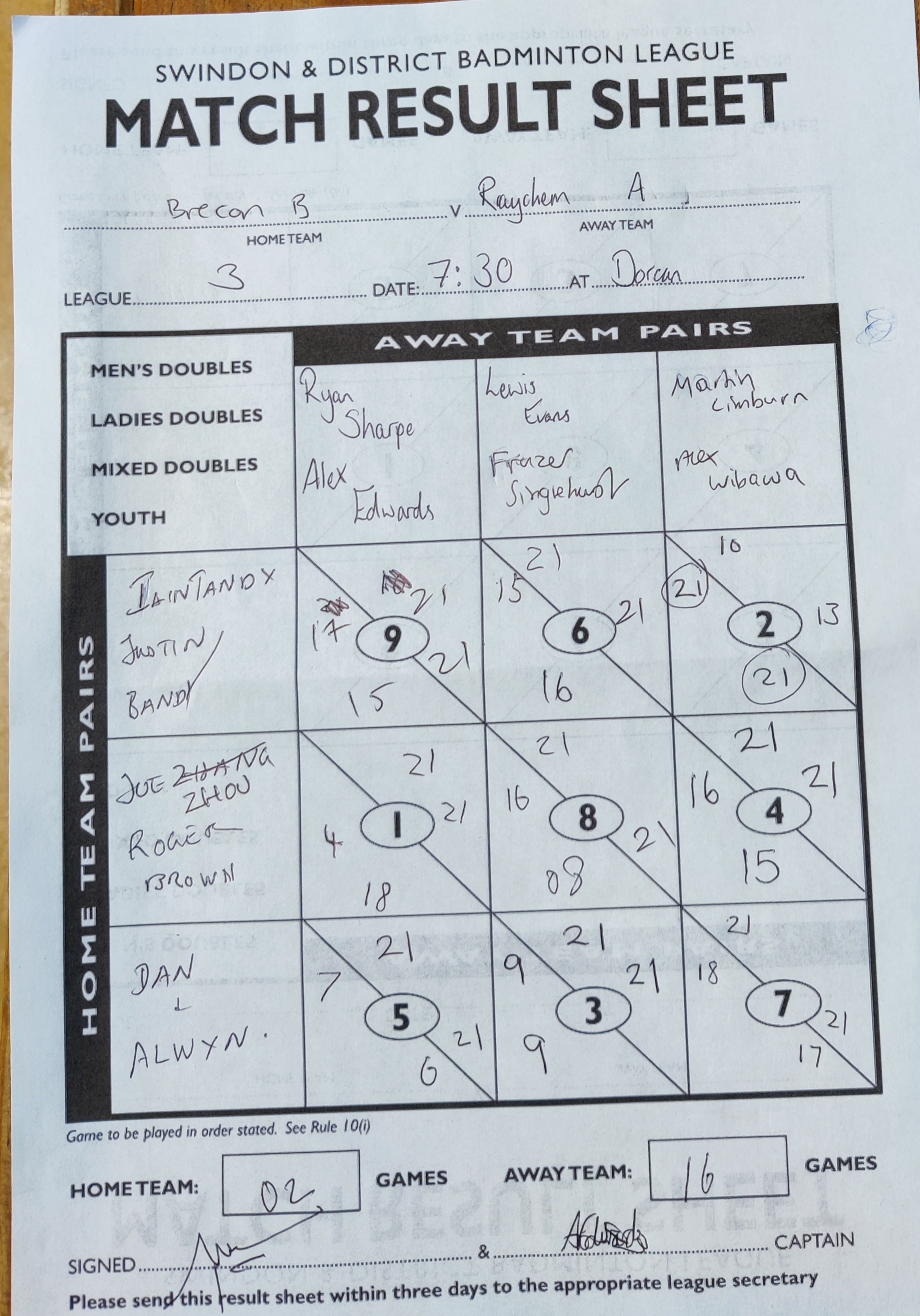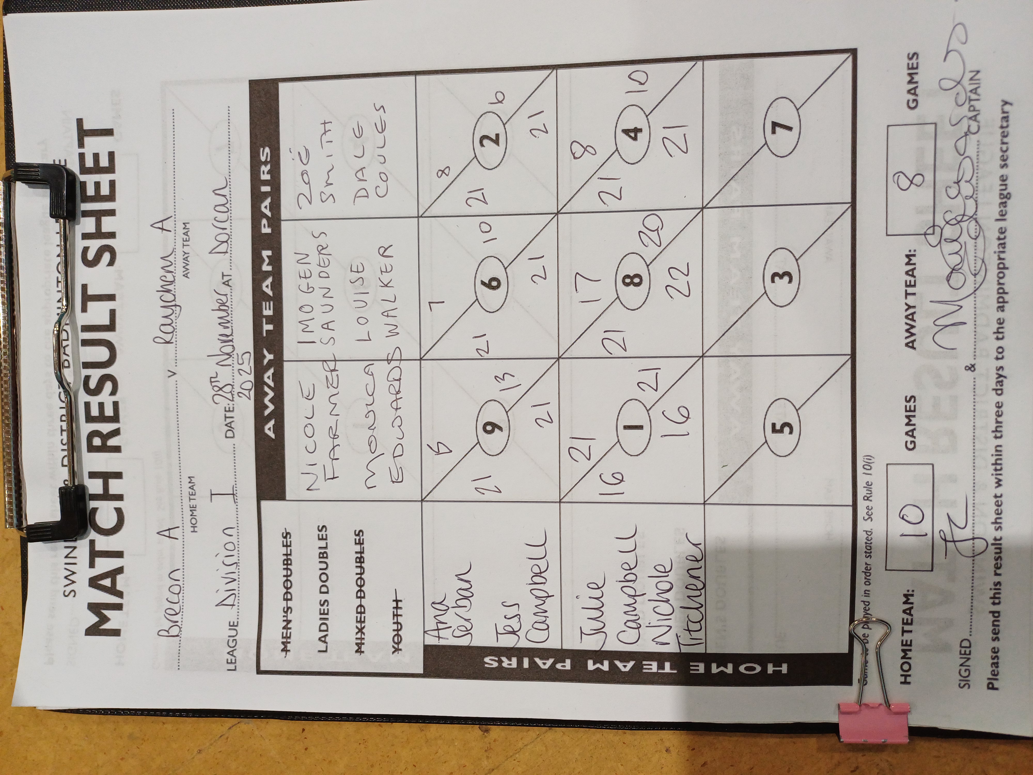 | 26-03-2026 | 20:00 | Thursday | Raychem A | Brecon B | Ridgeway Leisure Centre, Inverary Road, Wroughton, Swindon, SN4 9DJ | Upload | |