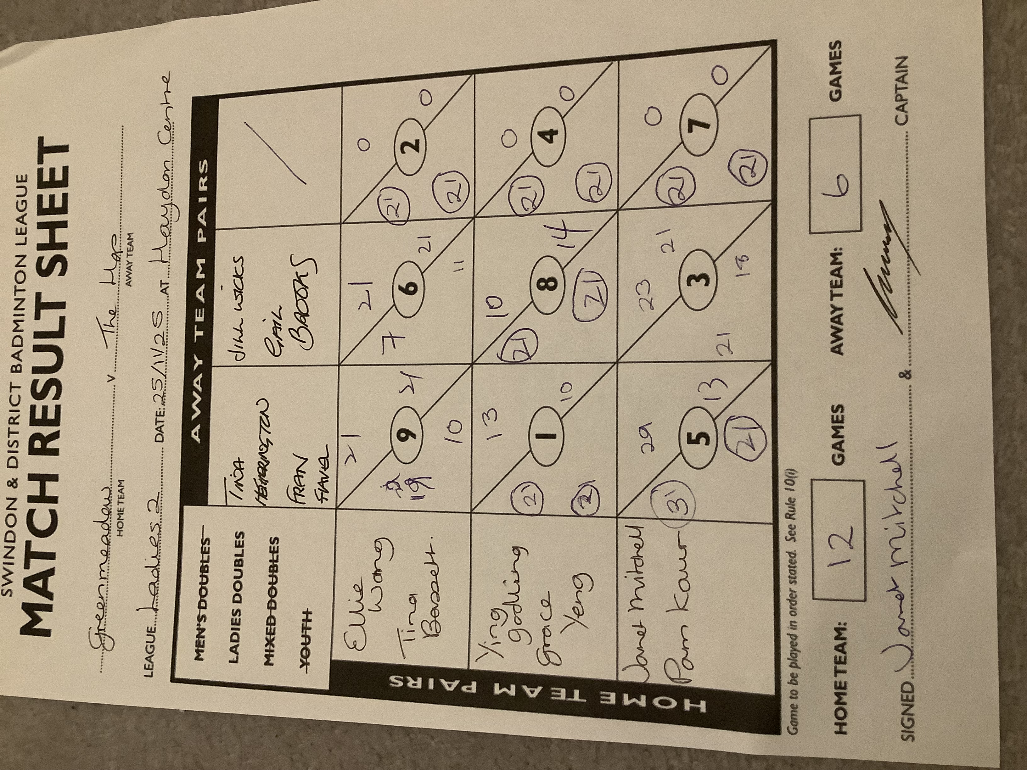 | 28-10-2025 | 19:00 | Tuesday | Greenmeadow B | Greenmeadow A | Haydon Centre, Thames Avenue, Swindon, SN25 1QQ | 3 - 15 | |