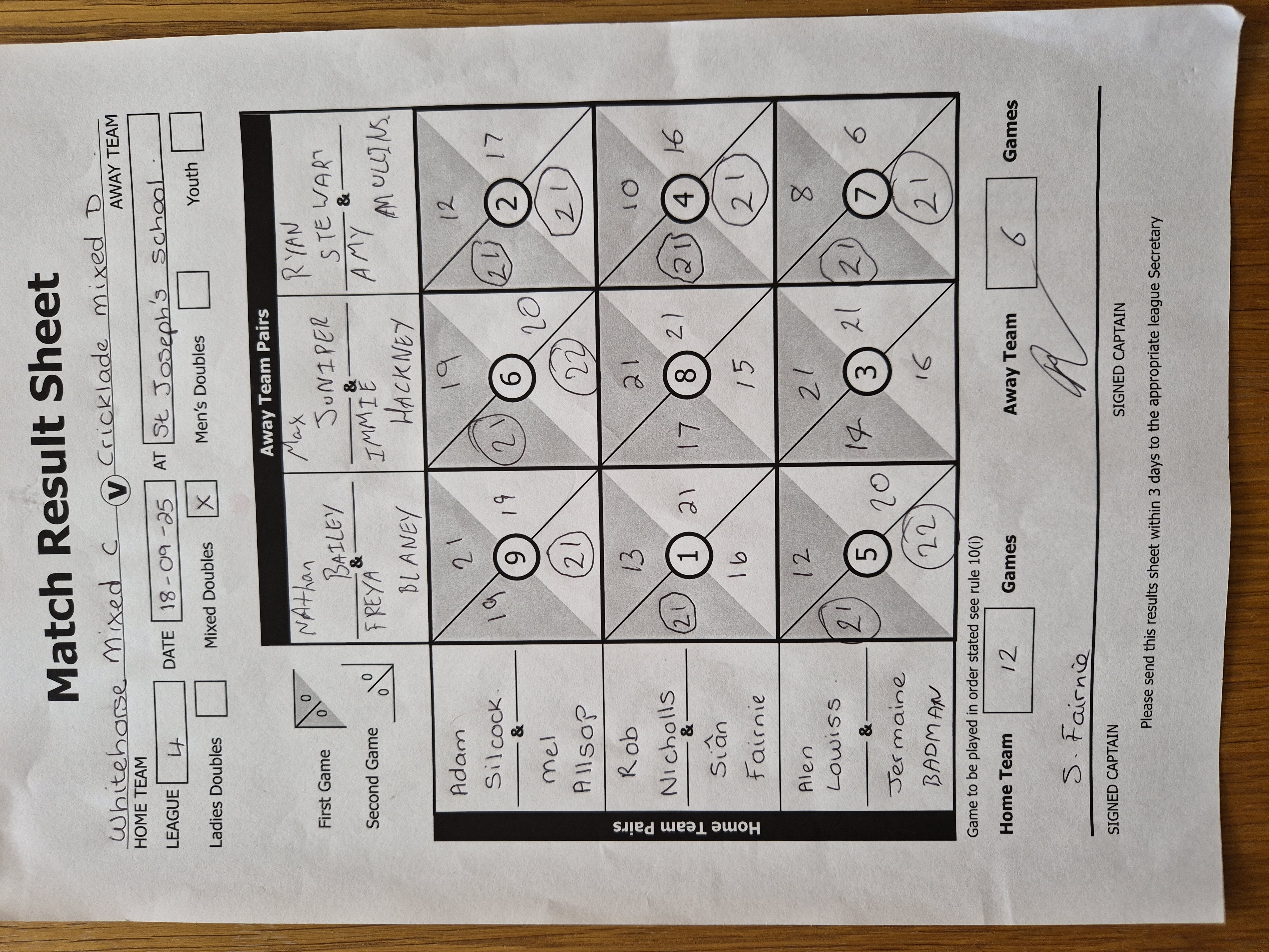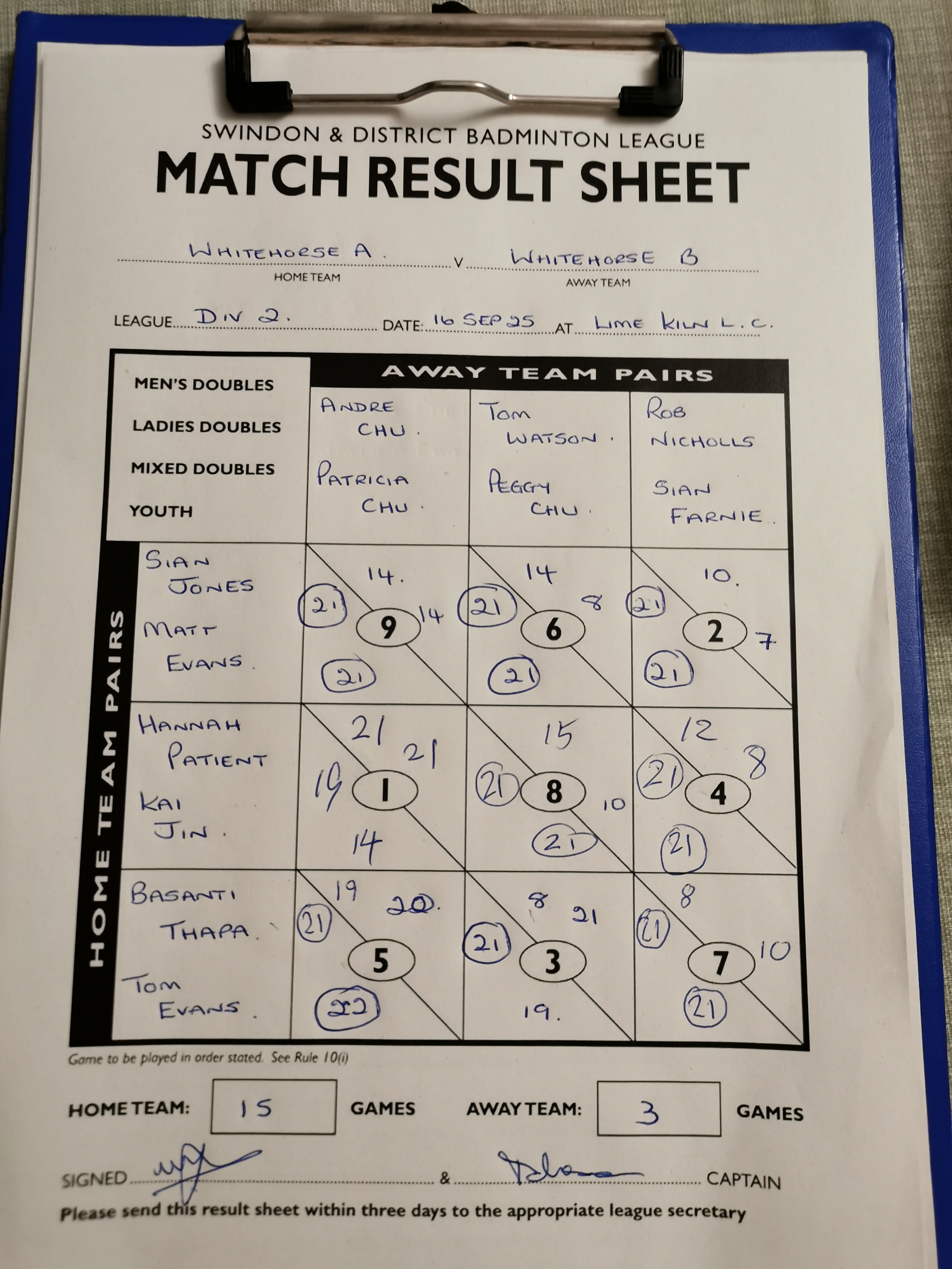 18-09-2025 | 20:00 | Thursday | Whitehorse C | Cricklade D | St Josephs College, Ocotal Way, Swindon, England, GB, SN3 3LR | 12 - 6 | |