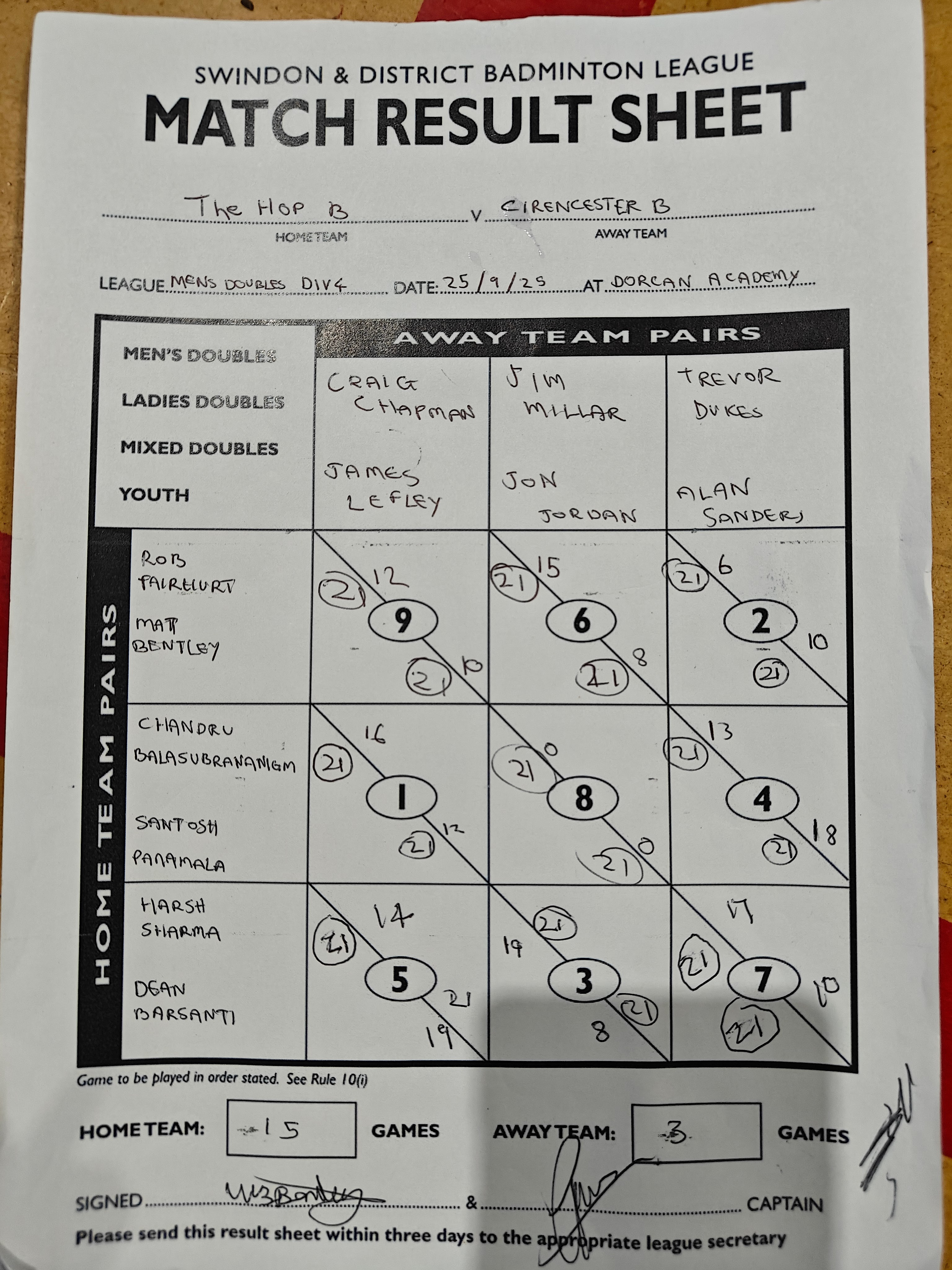 25-09-2025 | 19:20 | Thursday | The Hop B | Cirencester B | The Dorcan Academy, St Paul's Drive, Swindon, SN3 5DA | 15 - 3 | |
