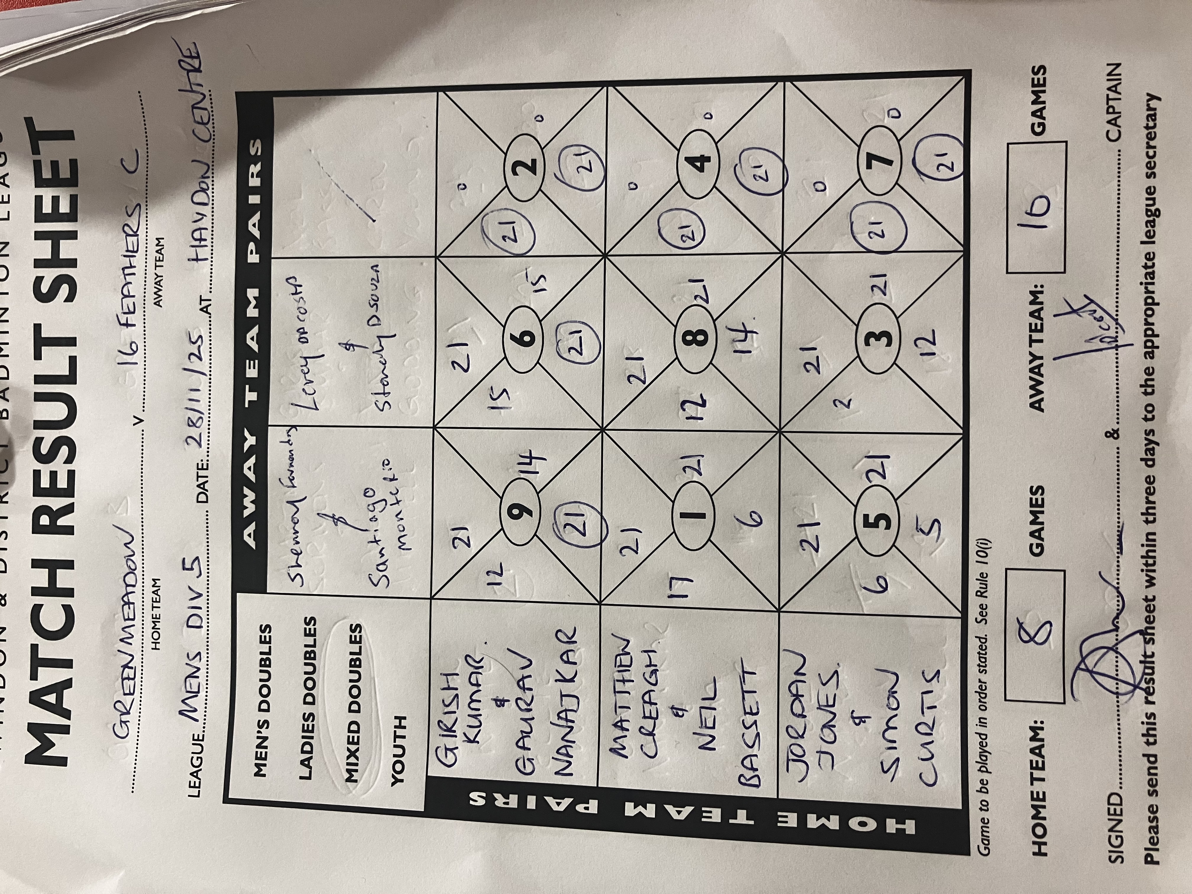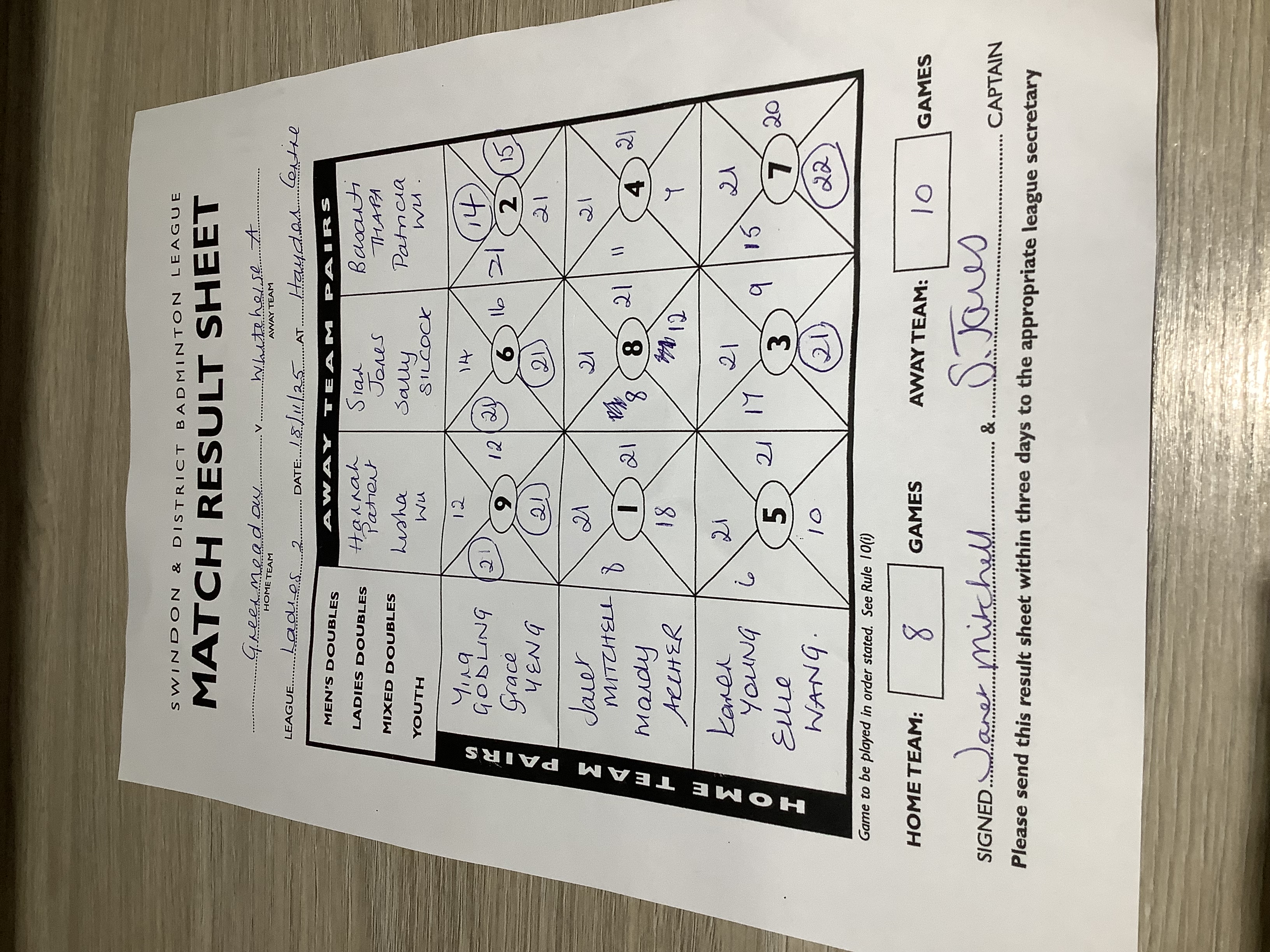 | 24-11-2025 | 19:00 | Monday | 16 Feathers A | Whitehorse A | Grange Leisure and Community Centre, Grange Dr, Swindon, SN3 4JY | 10 - 8 | |
