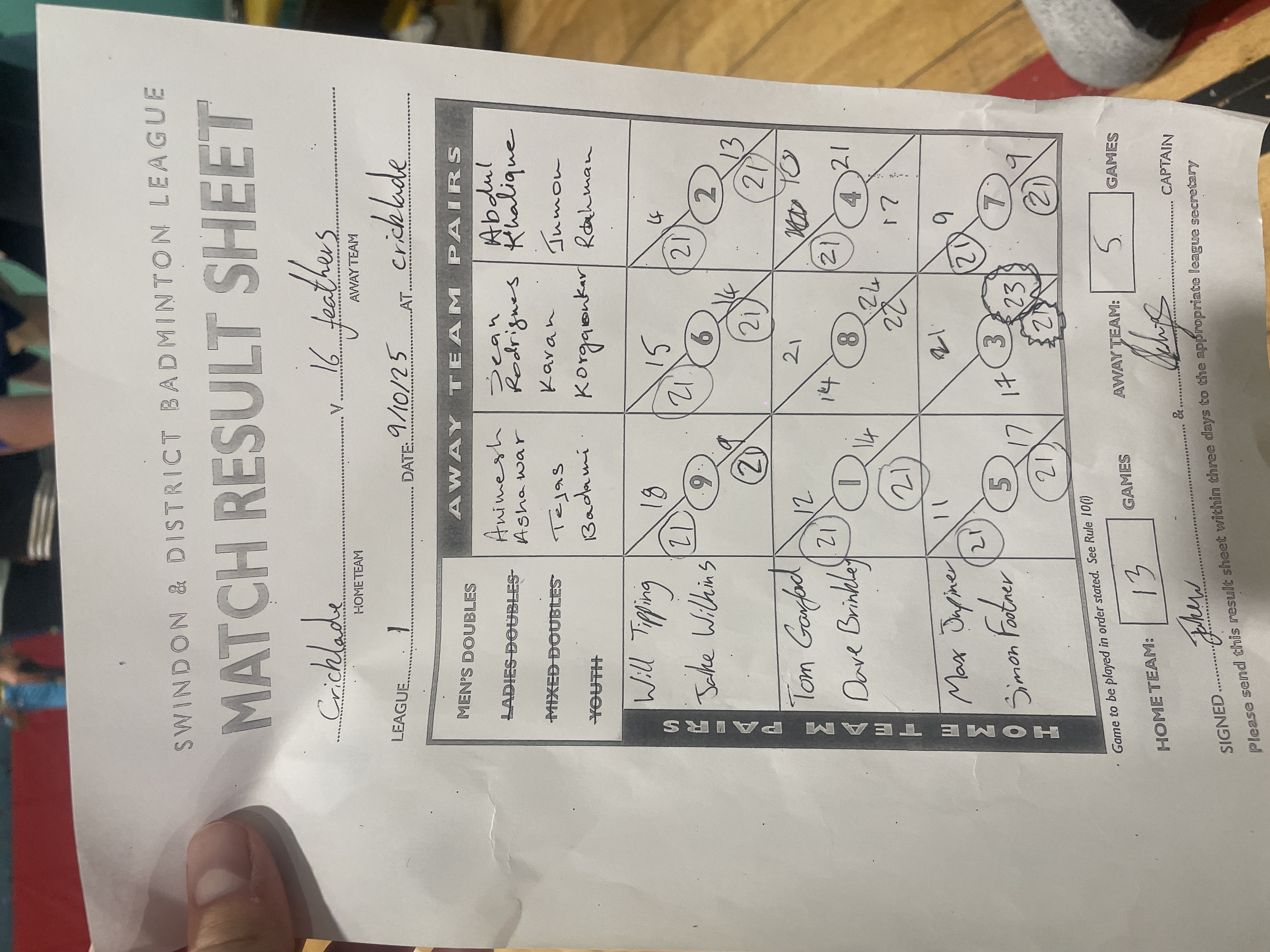 30-11-2025 | 18:45 | Sunday | Cricklade C | 16 Feathers B | Cricklade Leisure Centre, Stones Lane, Cricklade, Swindon, SN6 6JW | Upload | |
