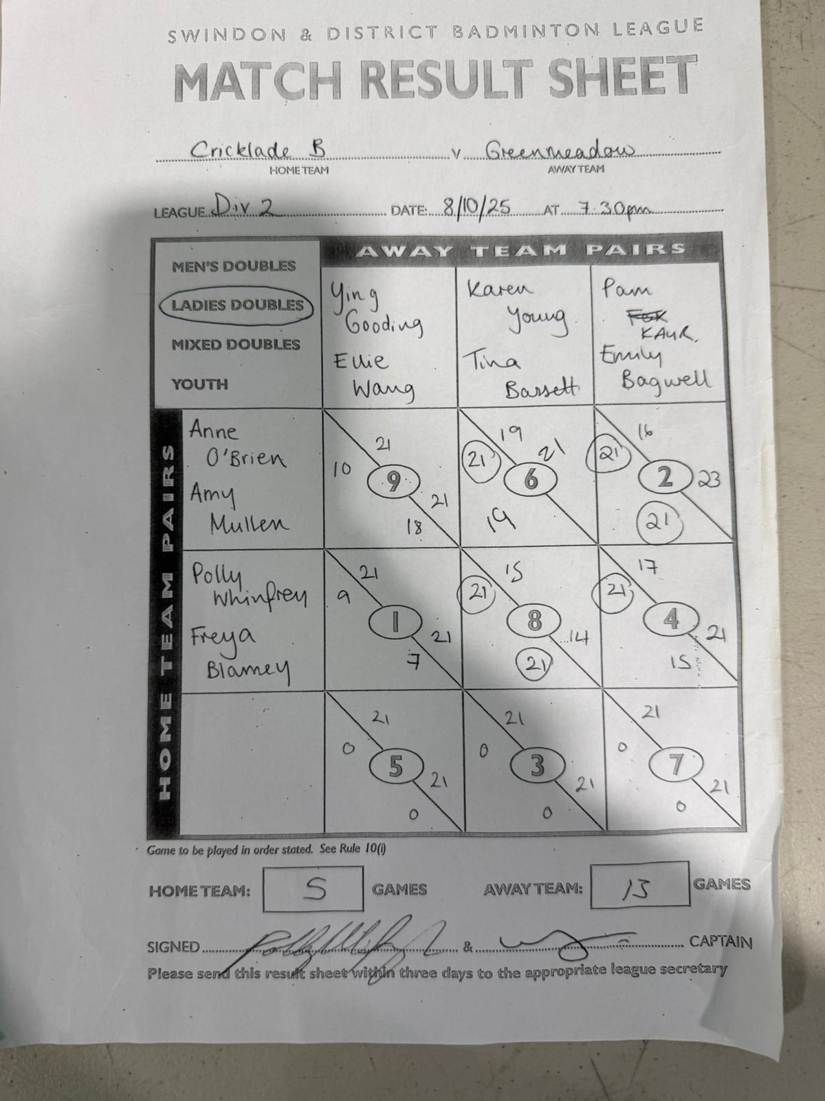 30-09-2025 | Tuesday | Greenmeadow A | The Hop A | Cricklade Leisure Centre, Stones Lane, Cricklade, Swindon, SN6 6JW | 4 - 14 | ||