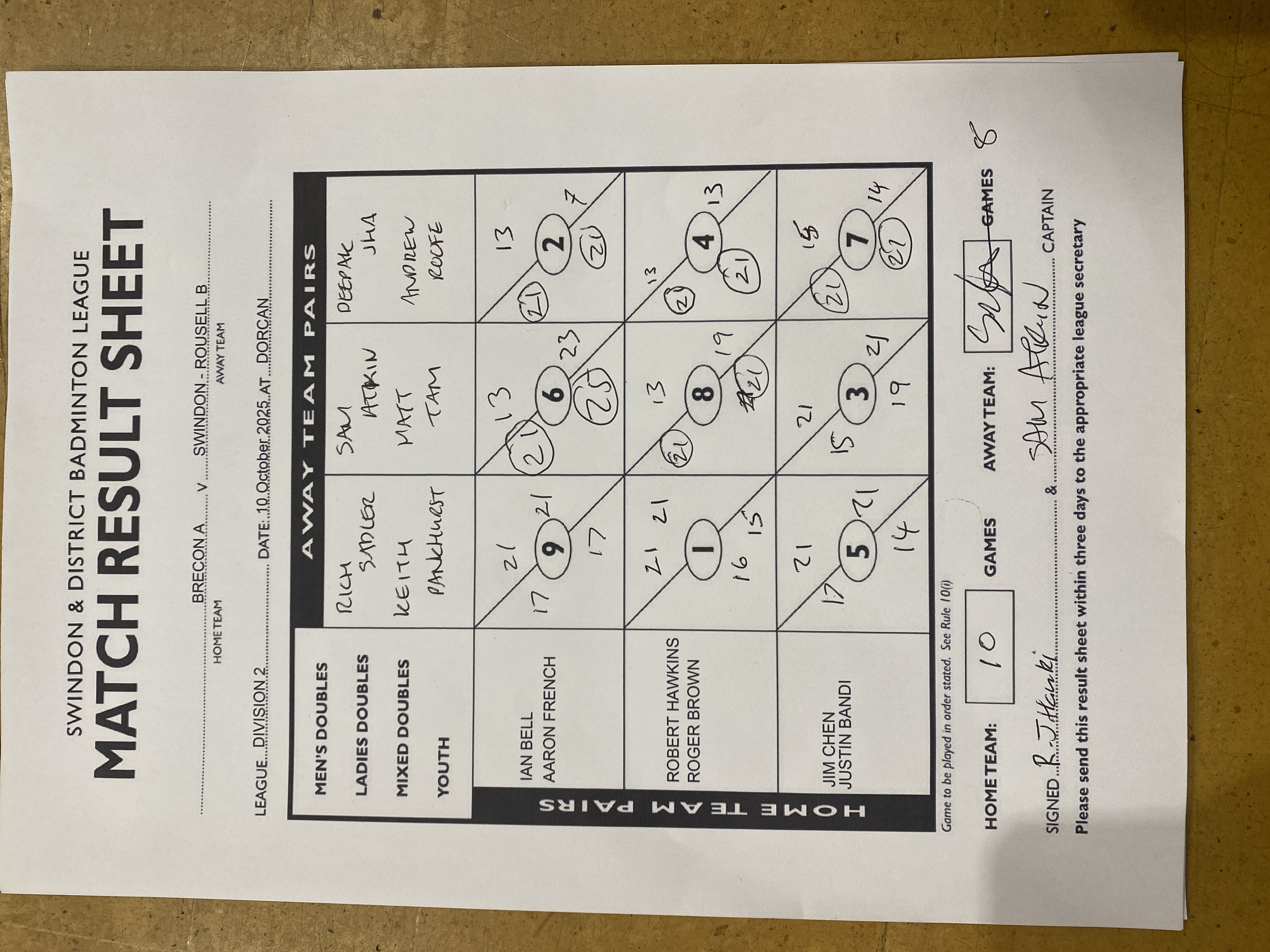 10-10-2025 | 19:30 | Friday | Brecon A | Swindon-Roussel B | Dorcan Sports Centre, Saint Pauls Drive, Swindon, SN3 5BY | 10 - 8 | |