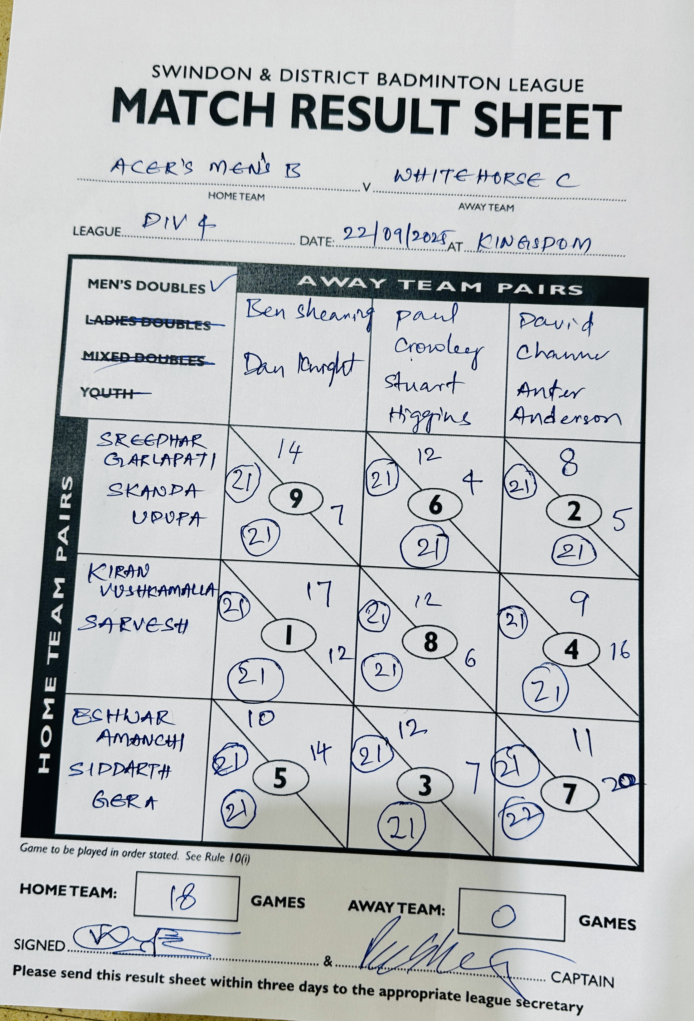 22-09-2025 | 19:00 | Monday | Acers B | Whitehorse C | Kingsdown Sports Centre, Hyde Rd, Swindon, SN2 7SH | 18 - 0 | |