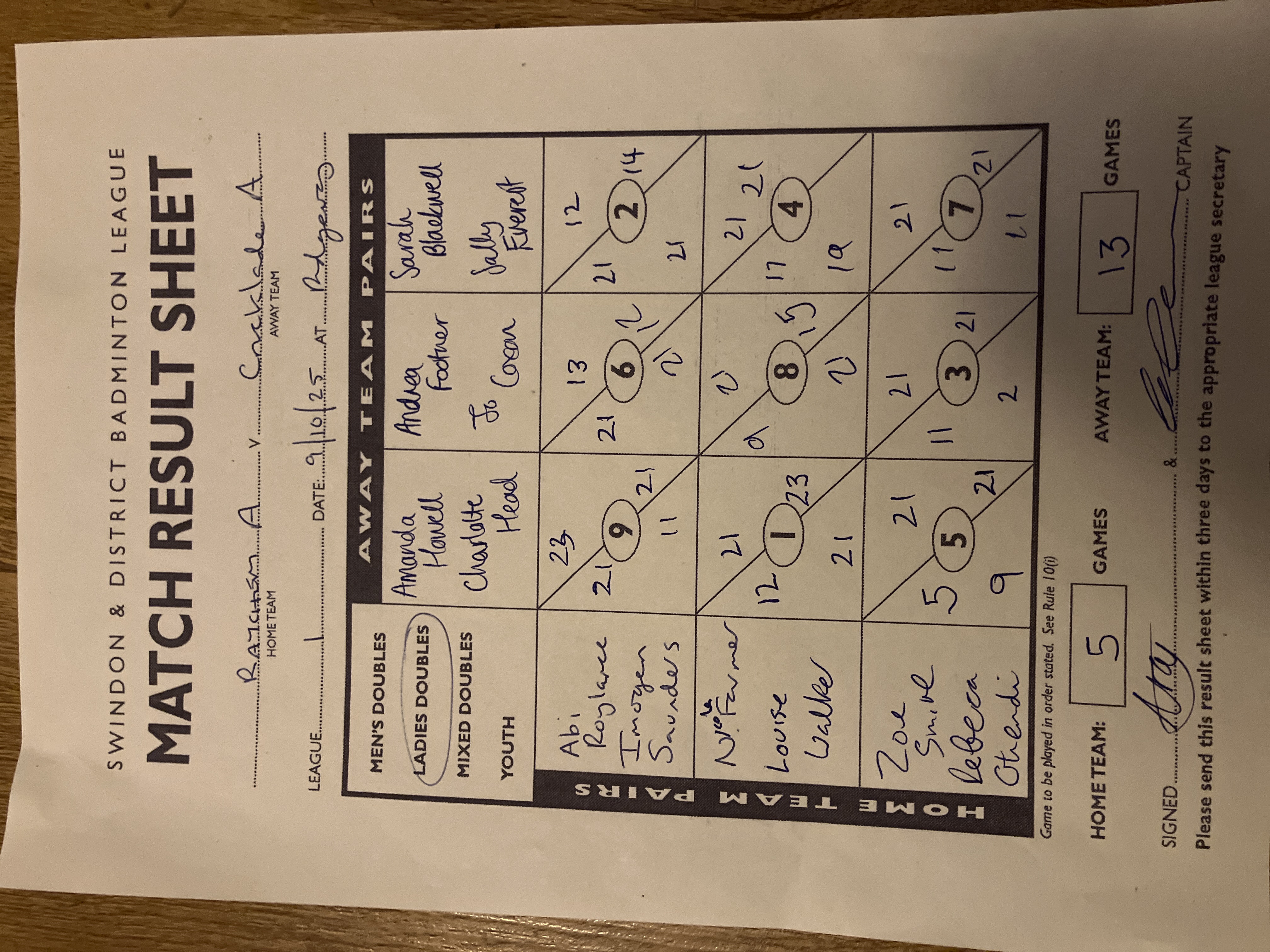 07-11-2025 | 19:30 | Friday | Swindon-Roussel B | Acers A | Cricklade Leisure Centre, Stones Lane, Cricklade, Swindon, SN6 6JW | Upload | |