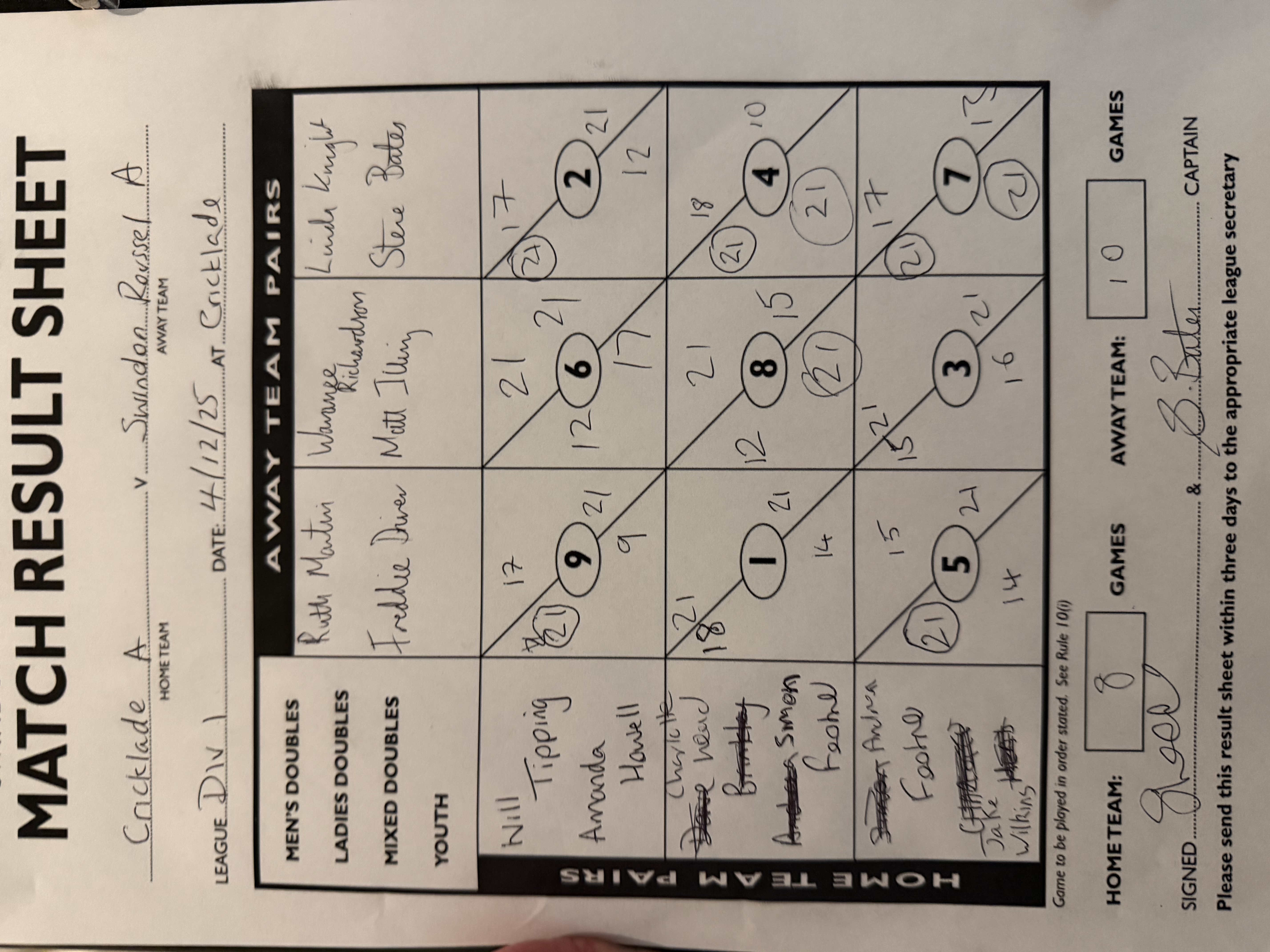 | 11-12-2025 | 20:00 | Thursday | Cricklade A | Swindon-Roussel A | Cricklade Leisure Centre, Stones Lane, Cricklade, Swindon, Wiltshire, SN6 6JW | Upload | |