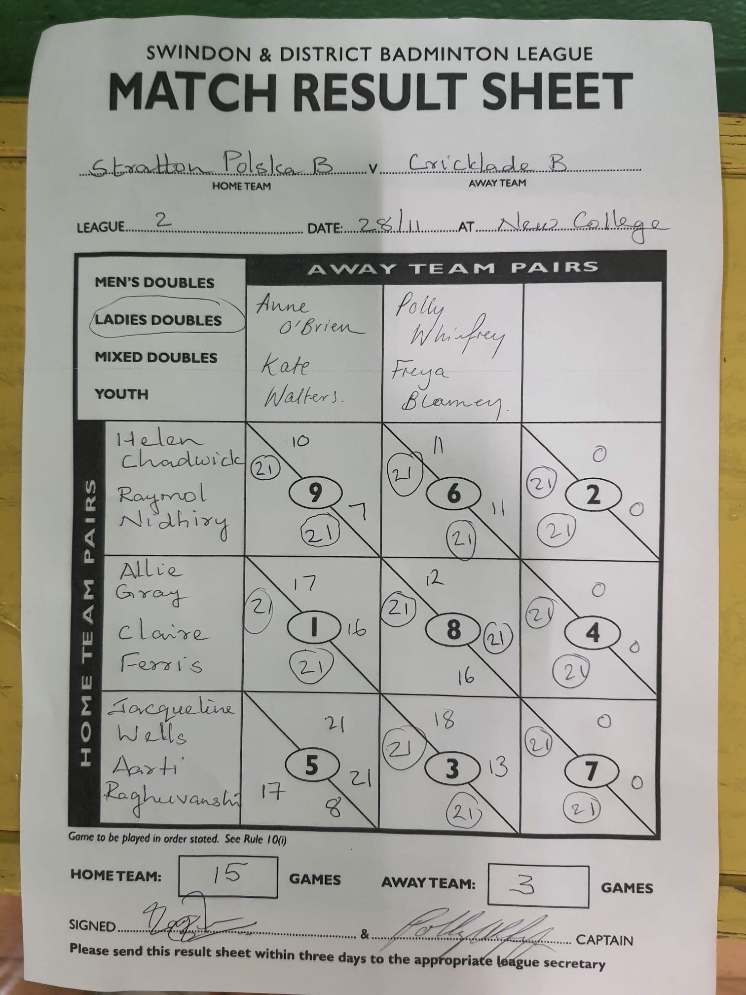| 26-09-2025 | 19:00 | Friday | Swindon-Roussel B | 16 Feathers B | Ridgeway Leisure Centre, Inverary Road, Wroughton, Swindon, SN4 9DJ | 11 - 7 | |