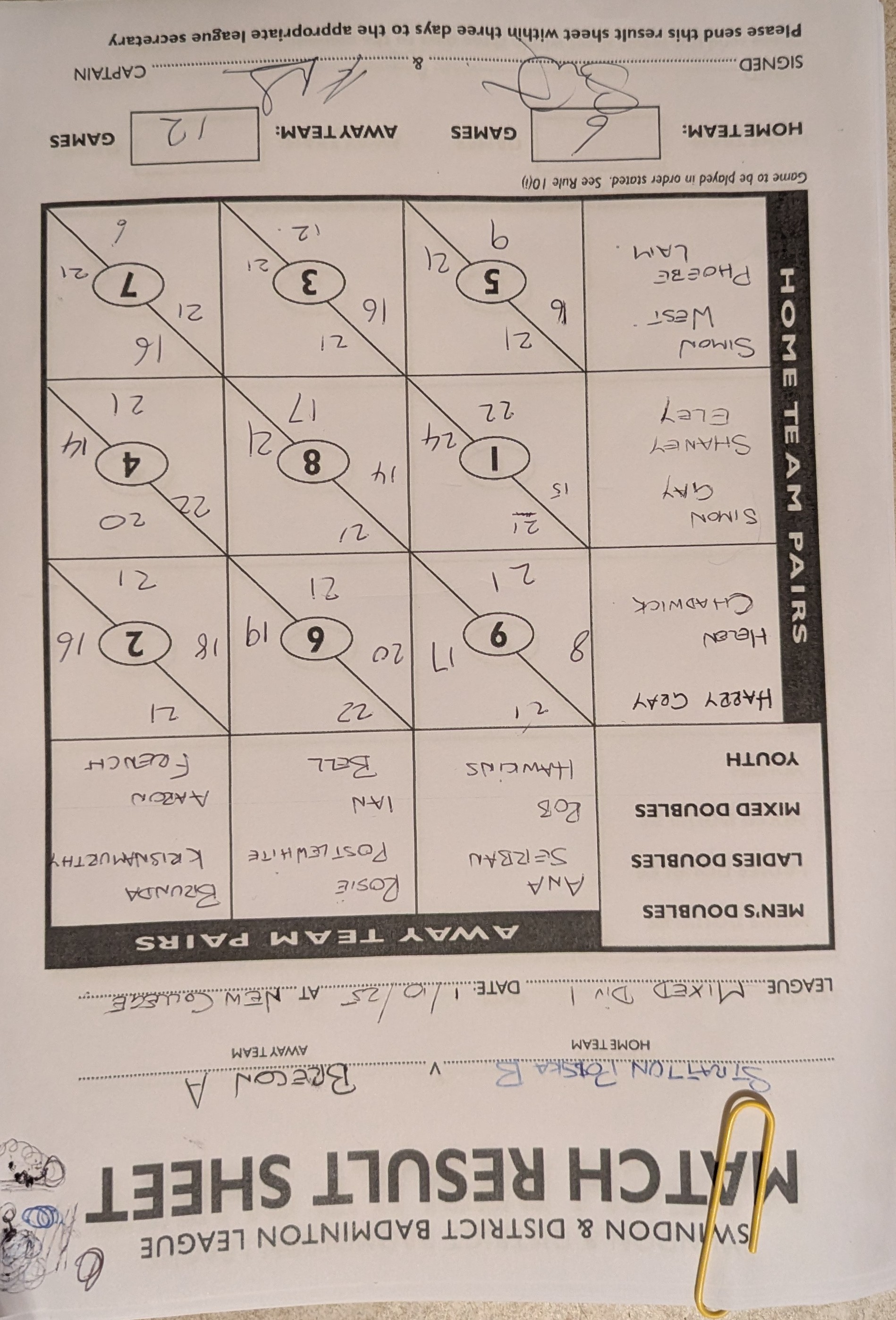 04-02-2026 | 20:00 | Wednesday | 16 Feathers A | Swindon-Roussel B | Lime Kiln Leisure Centre, Royal Wootton Bassett, Swindon, SN4 7HG | Upload | |